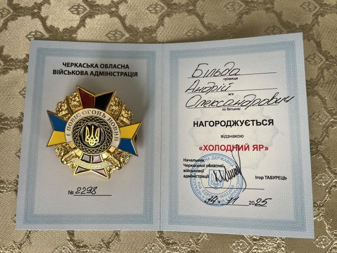 Отримав відзнаку «Холодний Яр» з рук начальника Черкаської обласної військової адміністрації Ігор Табурець.