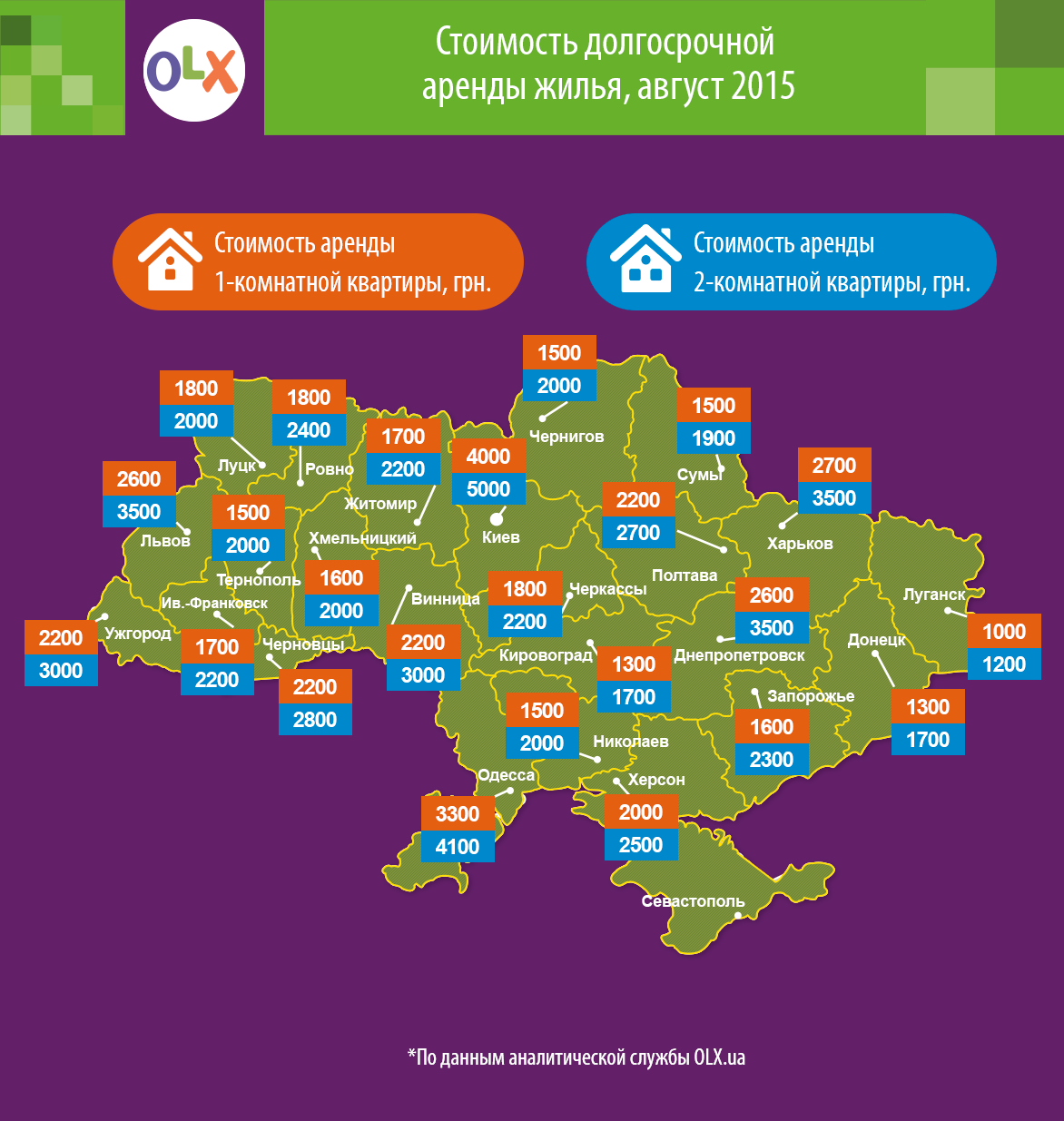 Найдорожча оренда квартир – у Києві. У кінці літа звідусіль до столиці з’їжджаються студенти. Проживання в 1-кімнатній квартирі обійдеться в середньому в 4 тис. грн. на місяць, а за «двушку» доведеться платити 5 тис. грн. на місяць. Традиційно недешево знімати житло в містах-мільйонниках – Одесі, Харкові, Львові, Дніпропетровську.
