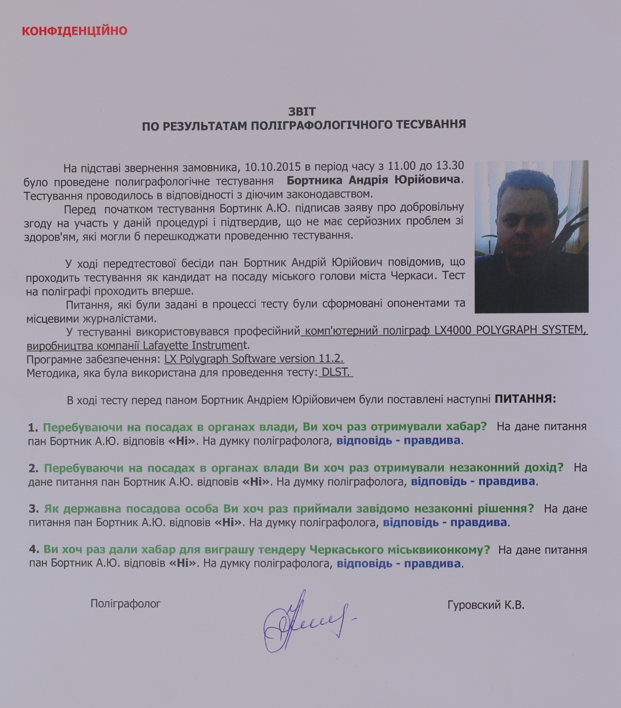 У суботу Андрій Бортник, як і обіцяв, пройшов перевірку на детекторі брехні. Проводив її досвідчений спеціаліст, член Британської та Європейської асоціації поліграфологів Костянтин Гуровський. Процес тривав близько чотирьох годин.