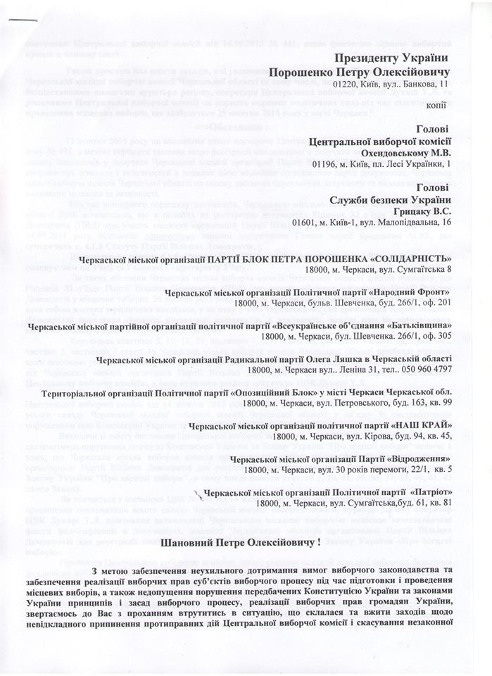 Окрім того, Олександр Радуцький звернувся до Президента України Петра Порошенка, аби в Черкасах були створені умови для волевиявлення, а Черкаській ТВК дали можливість нормально працювати.