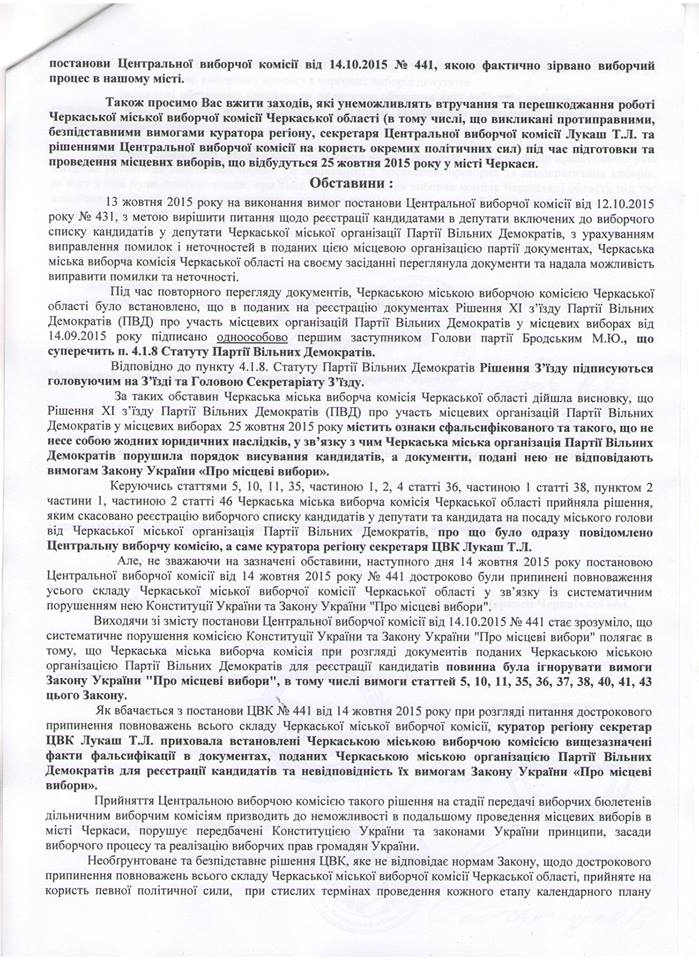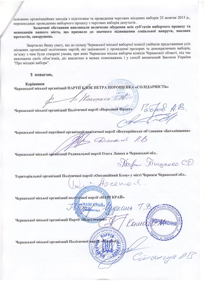 Крім того, учасники заходу висловилися за відміну постанови ЦВК як незаконної та безпідставної щодо розпуску Черкаської ТВК. Адже переконані, що Партія вільних демократів разом із своїм сателітом УКРОПом звертається з численними заявами до судів саме з метою недопущення проведення прозорих та демократичних виборів у Черкасах. Адже судові процеси призведуть до зриву волевиявлення. Зокрема, про це наголосив кандидат у депутати міської ради, заслужений будівельник України Ігор Калашник.