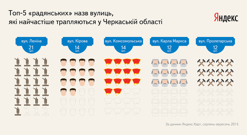 Інфографіку про найпопулярніші «радянські» назви вулиць в інших областях України та їх довжину можна переглянути в альбомі: https://fotki.yandex.ru/users/ya-ukraine-official/album/490764.