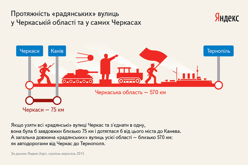 Якщо узяти всі «радянські» вулиці Черкас та з'єднати в одну, вона була б завдовжки близько 75 км і дотяглася б від цього міста до Канева. А загальна довжина «радянських» вулиць усієї області – близько 570 км: як автодорогами від Черкас до Тернополя.