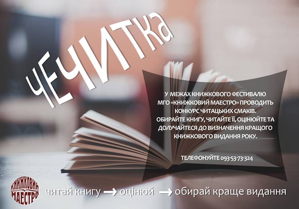 Конкурс читацьких смаків «ЧЕчитка» від ГО «Книжковий маестро» популяризує сучасних молодих українських авторів та вітчизняну літературу, а також долучає молодь до читання. Вже маємо книги А. Чапая «Тато в декреті», А. Бондара «І тим, що в гробах», М. Кідрука «Зазирни у мої сни», М. Лаюка «Баборня».