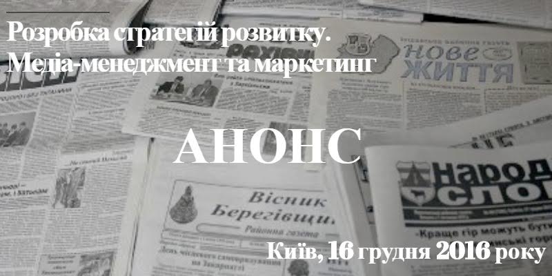 Як стратегічно планувати розвиток газети? Як працювати з новими медіа? Способи монетизації контенту та знання з медіа-маркетингу. Про все це йтиметься на тематичному тренінгу «Розробка стратегій розвитку. Медіа-менеджмент та маркетинг. Стратегія продажу газет», який відбудеться 16 грудня 2016 року у Києві.