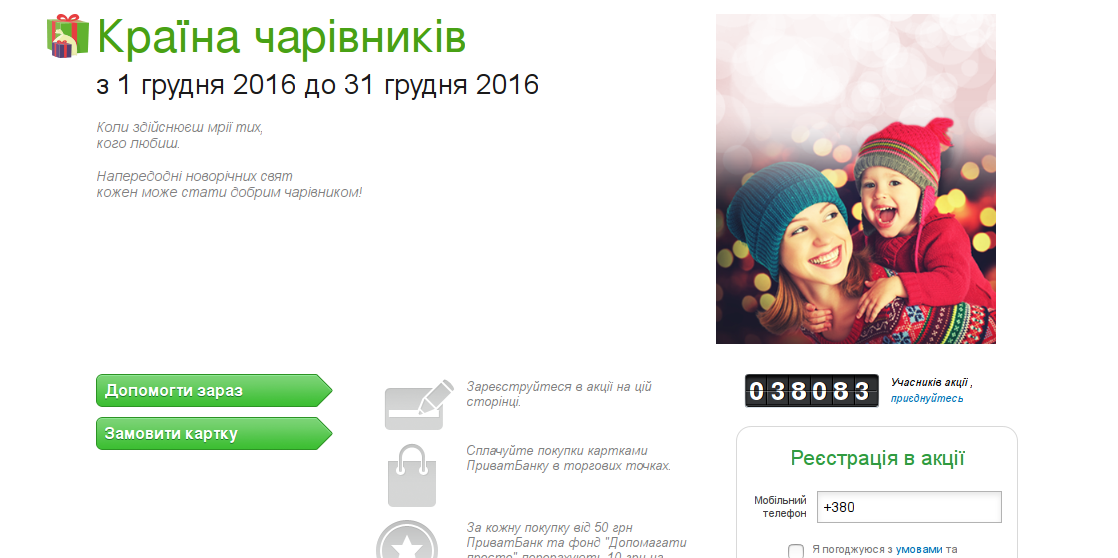 Щоб стати учасником чарівної акції, потрібно просто зареєструватися на її сторінці в Інтернеті https://promos.privatbank.ua/ua/promos/krayina-charivnikiv. Починаючи з 1 грудня і до нового року щоразу, коли учасники акції будуть розплачуватися картками за покупки на суму понад 50 грн, з фонду акції будуть автоматично перераховані 10 грн на покупку ліків для онкохворих дітей.