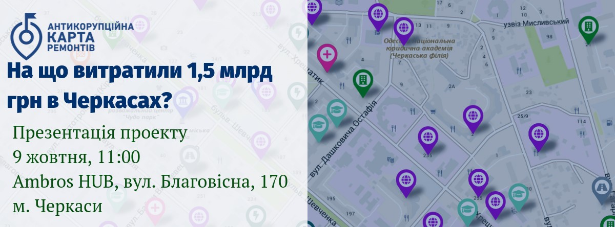 Антикорупційна карта ремонтів – це перша онлайн-платформа, яка оновлюється в режимі реального часу, містить максимальну базу ремонтів включно з найвіддаленішими куточками країни, має зручний інтерфейс та можливість зворотного зв’язку. За допомогою Карти можна легко контролювати мільярди гривень, які щороку виділяються місцевою владою на проведення ремонтних робіт у школах, садочках, лікарнях, гуртожитках, житлових будинках, парках тощо.