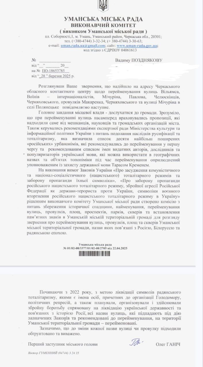 Уманська міська рада у відповіді на звернення щодо перейменування вулиць Вільямса, Воїнів-інтернаціоналістів, Мічуріна, Павлова, Челюскінців, Черняховського, провулка Макаренка в м. Умань та вулиці Мічуріна в с. Полянецьке, повідомила, що такі рішення приймаються загалом з урахуванням думки громади, науковців і громадських організацій.