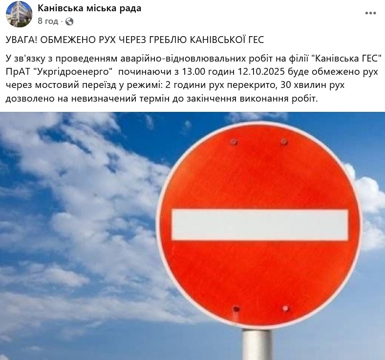 У зв'язку з проведенням аварійно-відновлювальних робіт на філії "Канівська ГЕС" ПрАТ "Укргідроенерго" починаючи з 13.00 годин 12 жовтня обмежено рух через мостовий переїзд у режимі: 2 години рух перекрито, 30 хвилин рух дозволено на невизначений термін до закінчення виконання робіт.