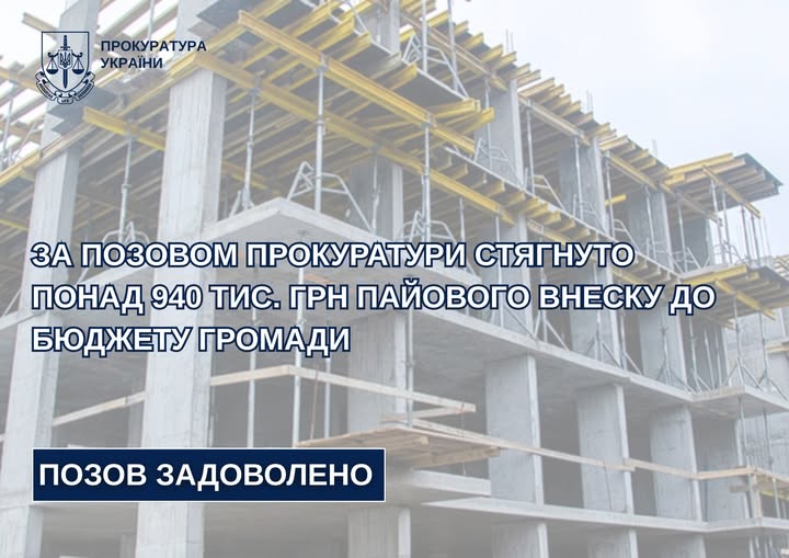 За позовом Черкаської окружної прокуратури до місцевого бюджету стягнуто понад 940 тисяч гривень пайового внеску, який забудовник не сплатив під час будівництва житлового будинку в Черкасах.
