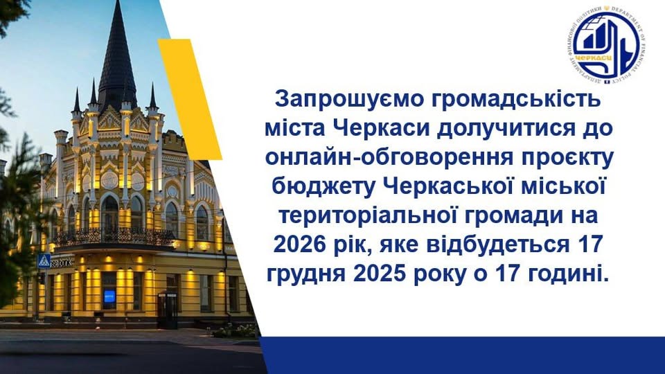 Громадськість міста Черкаси запрошують долучитися до онлайн-обговорення проєкту бюджету Черкаської міської територіальної громади на 2026 рік, яке відбудеться 17 грудня 2025 року о 17 годині.