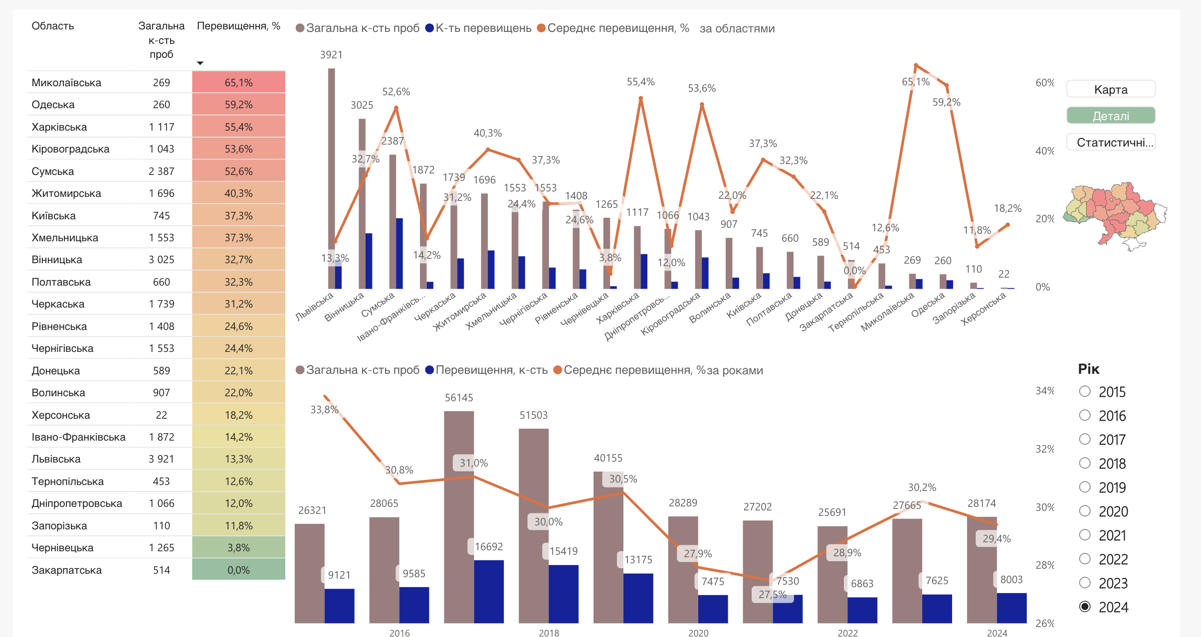 Значний відсоток проб з перевищенням спостерігається у Житомирській області — 40,3%, Хмельницькій та Київській — 37,3%, Вінницькій — 32,7%, Полтавській — 32,3%, Черкаській — 31,2%. Найнижчі показники видно на заході країни: Закарпатська область має 0% проб із перевищенням, Чернівецька — 3,8%, Тернопільська — 12,6%, Львівська — 13,3%. У Луганській області (з 2022 року, а до 2022 року - до 13 % проб з перевищеннями) та АР Крим даних немає через неможливість проведення моніторингу.