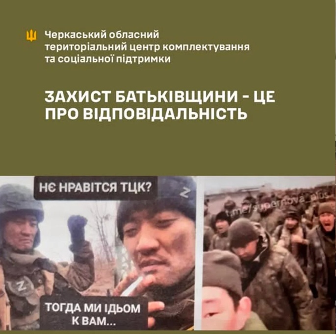 Реклама, на якій зображені буряти, покликана пояснити, чим може загрожувати ухилення від військової служби. Відповідний допис днями з'явився на сторінці Черкаського обласного ТЦК у Facebook.