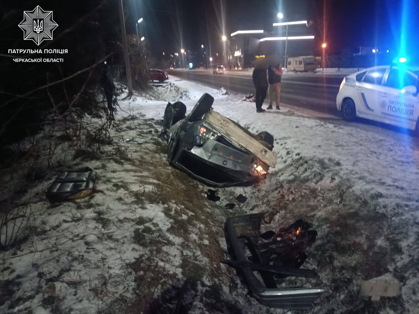 Як повідомляє патрульна поліція Черкаської області, водій авто BMW не дотримався безпечної швидкості, не впорався з керуванням та здійснив наїзд на бордюрний камінь. Внаслідок автопригоди транспортний засіб перекинувся.