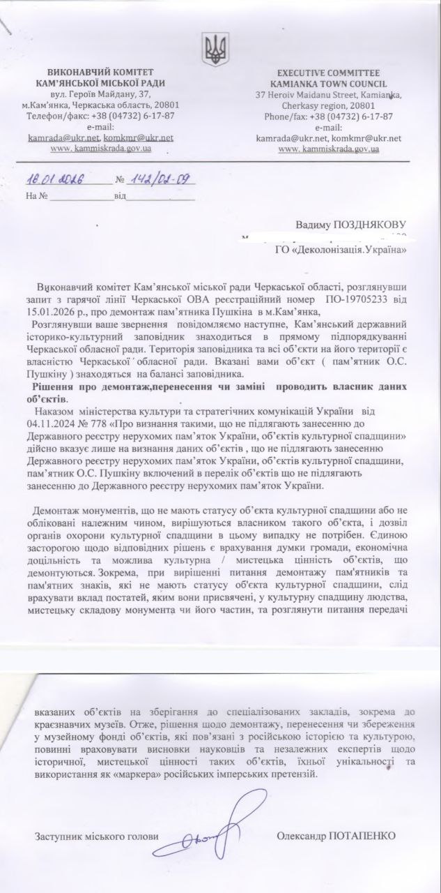У відповіді на звернення активістів представники міської влади зазначили, що пам’ятник нібито перебуває на балансі Черкаської обласної ради, та порадили адресувати вимоги щодо його демонтажу саме обласному органу влади.