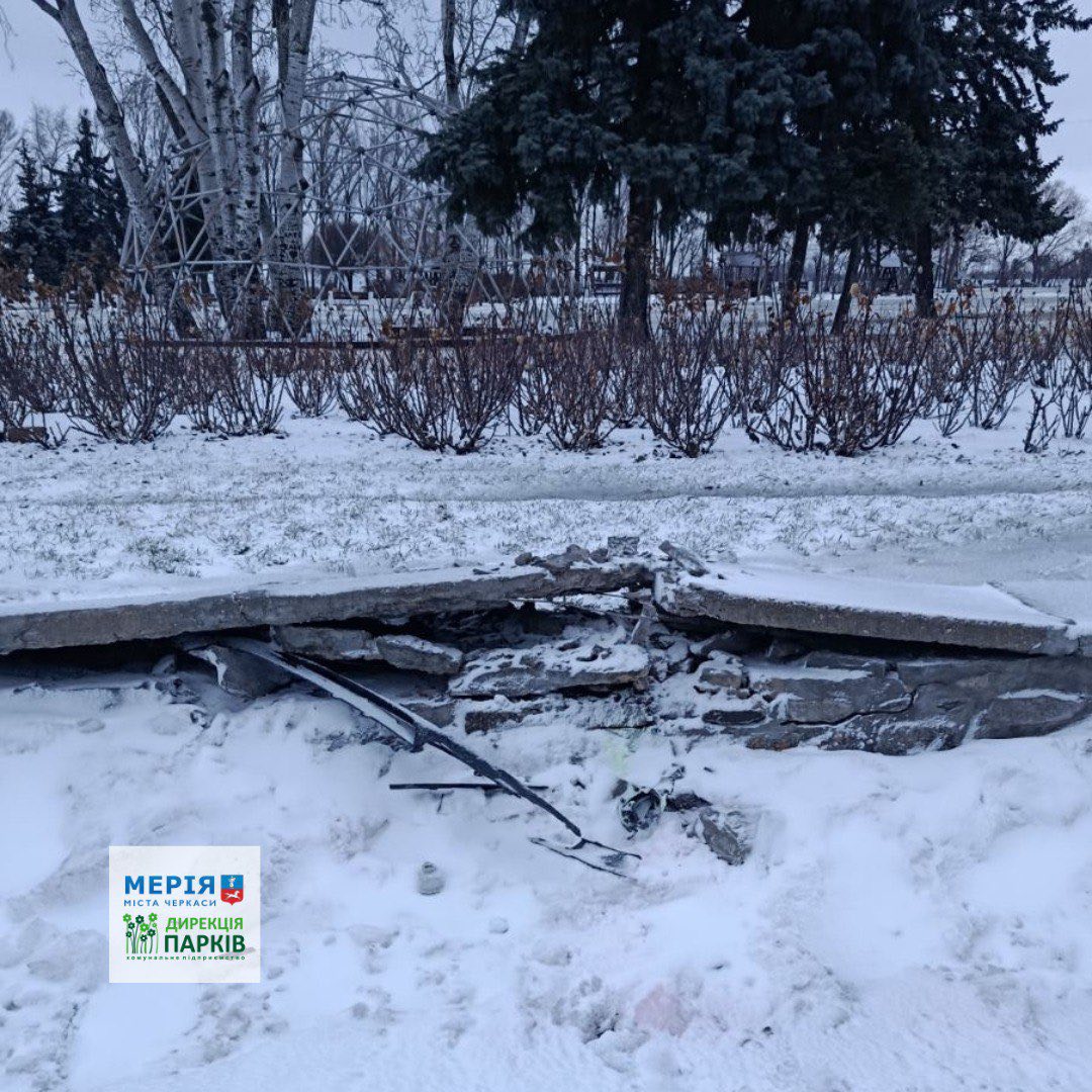 Під час чергового обходу працівники КП «Дирекція парків» виявили значне пошкодження кам’яного парапету: на нього наїхало авто, загубивши від удару свій номерний знак.
