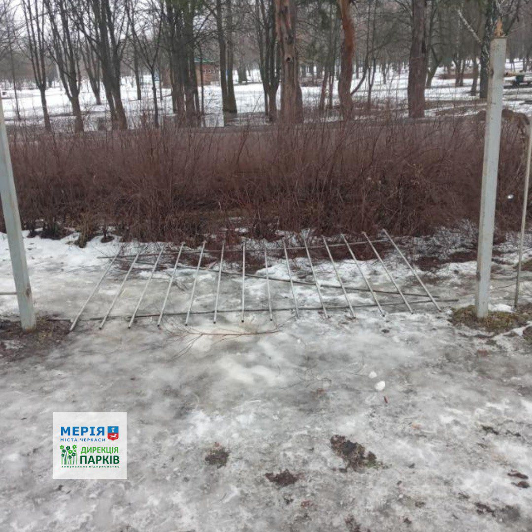 Як повідомили у КП «Дирекція парків», лише минулого четверга, 12 лютого, працівники підприємства відремонтували металеву огорожу та приварили одну з пошкоджених секцій. Однак уже 18 лютого під час чергового огляду фахівці виявили, що цю ж частину паркану знову відірвали та кинули під труби теплотраси.