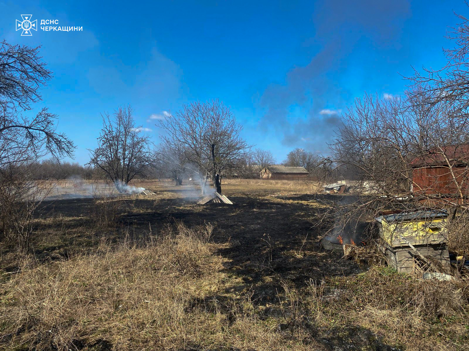 З аналогічної причини загорілася суха рослинність у Черкаському та Золотоніському районах. Ще до прибуття пожежних вогонь перекинувся на поруч розташовані надвірні споруди. Постраждалих немає.