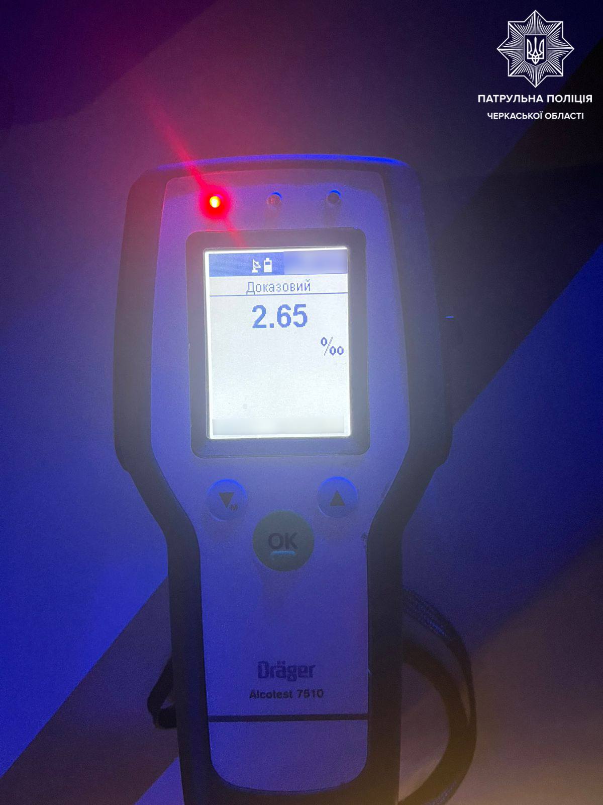 Спілкуючись із керманичем авто Fiat, поліцейські виявили в нього ознаки алкогольного сп'яніння та запропонували йому пройти відповідний огляд, на що останній погодився. Результат — 2,65 проміле, що у понад 13 разів перевищує допустиму норму. Також, інспектори встановили, що водій не має із собою свідоцтва про реєстрацію транспортного засобу.