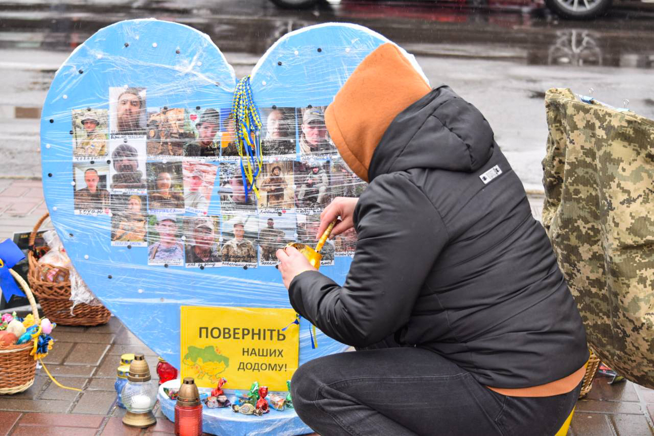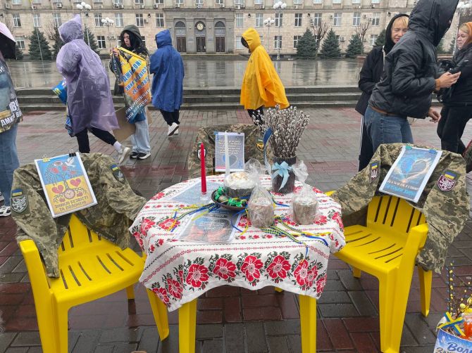 Кошики з пасками, військова форма на стільцях та серце, обклеєне фотографіями зниклих безвісти та тих, хто в полоні — таку інсталяцію підготували на акцію перед Великоднем у Черкасах. На ній зібралися понад пів сотні людей.