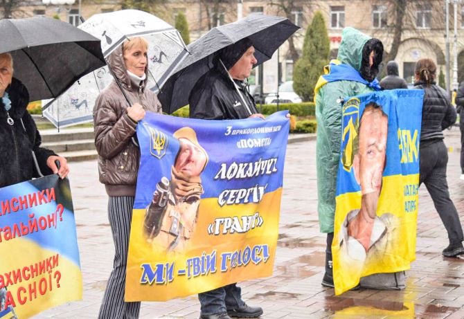 Під дощем з парасолями, в дощовиках та з плакатами рідних в руках стояли вздовж Соборної площі учасники акції. Серед них — в очікуванні брата Валентина Саліхова. Вона розповіла, що спілкувалися з ним за два дні до його зникнення.