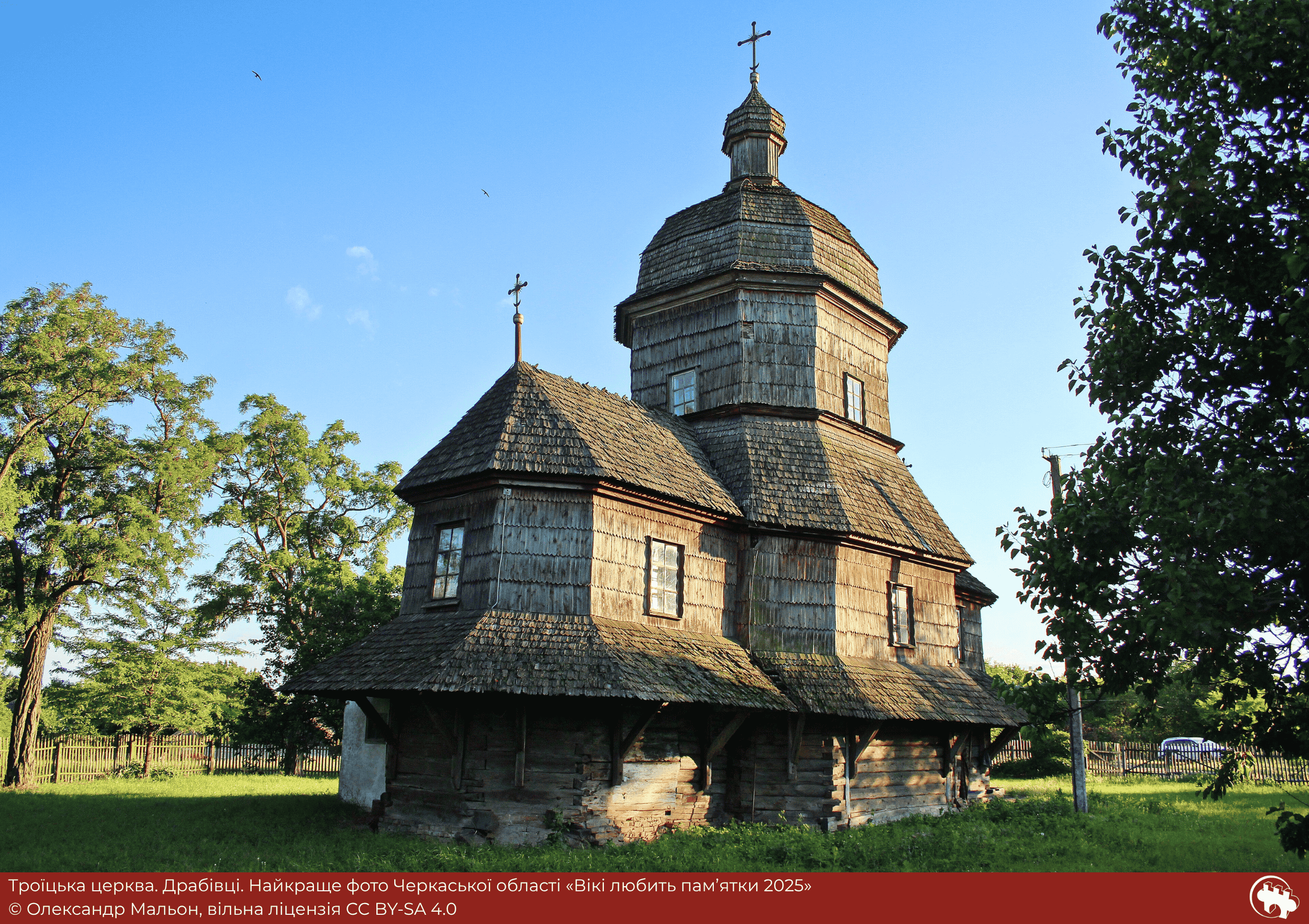 Найкращим фото Черкаської області у конкурсі «Вікі любить пам’ятки 2025» стала світлина Троїцької церкви у селі Драбівці. Автор — Олександр Мальон.