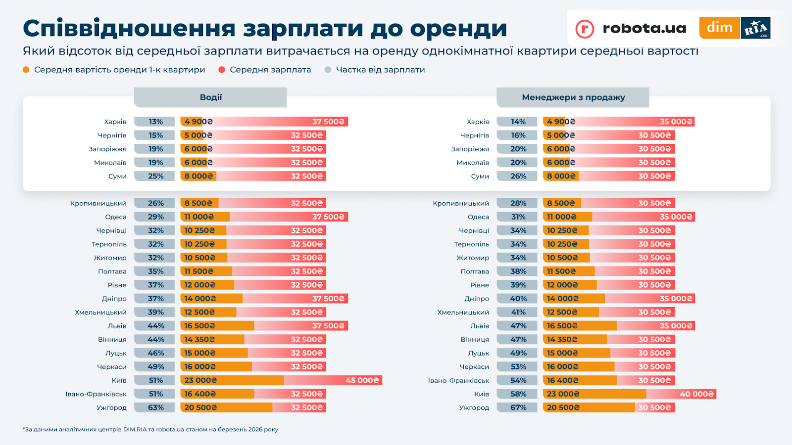 Тож, водій у Києві із заробітною платою у 45 000 грн сплачує 51% доходу за однокімнатну квартиру. У Харкові водій заробляє трохи менше — 37 500 грн, а частка оренди тут складає тільки 13%. У трьох інших великих містах водій у середньому має такий самий рівень доходу, але частка витрат на оренду вища: Одеса — 29%, Дніпро — 37%, Львів — 44%.