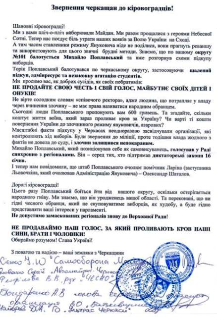 Народний депутат України Михайло Поплавський подав до суду Кіровоградської області на організацію Координаційної ради сил Майдану Черкащини.