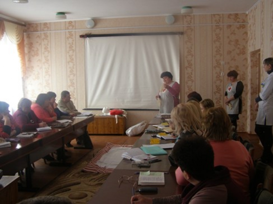 Інструктор районної організації Наталія Марунич та медична сестра Жанна Слободяник ознайомили присутніх із принципами надання першої допомоги при невідкладних станах. Крім теоретичної частини було проведено практичні заняття з використанням манекена-тренажера.