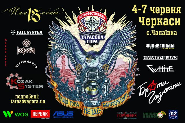 Мотофестиваль Тарасова Гора ось уже 13 piк поспіль збирає двоколісних та їхніх друзів. Колись Тарас казав «Мені тринадцятий минало...». У 2015 році ми yci дружньо скажемо «Нам тринадцятий минає!» Традиційно у перші вихідні літа Шевченків край наповниться гуркотом тисяч коліс та ревінням моторів.
