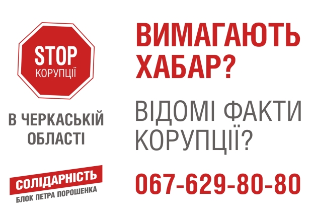У Черкаській області стартує проект «Стоп корупція». Ініціює боротьбу з корупціонерами територіальна організація партії «Блок Петра Порошенка «Солідарність».