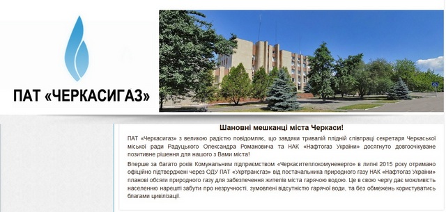 «ПАТ «Черкасигаз» з великою радістю повідомляє, що завдяки тривалій плідній співпраці секретаря Черкаської міської ради Радуцького Олександра Романовича та НАК «Нафтогаз України» досягнуто довгоочікуване позитивне рішення для нашого з Вами міста! – мовиться в повідомленні. – Вперше за багато років Комунальним підприємством «Черкаситеплокомуненерго» в липні 2015 року отримано офіційно підтверджені через ОДУ ПАТ «Укртрансгаз» від постачальника природного газу НАК «Нафтогаз України» планові обсяги природного газу для забезпечення жителів міста гарячою водою. Це, в свою чергу, дає можливість населенню нарешті забути про незручності, зумовлені відсутністю гарячої води, та без обмежень користуватись благами цивілізації».