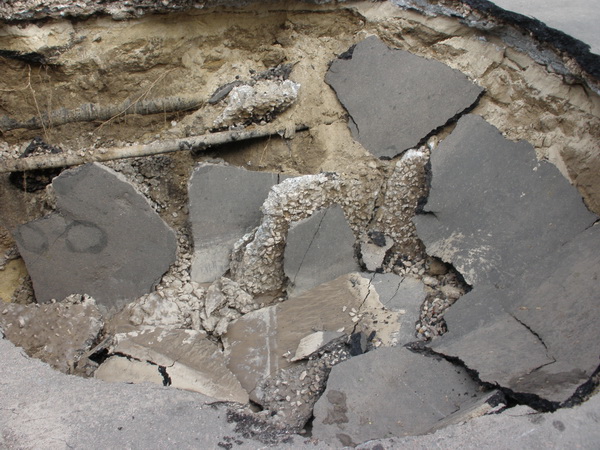 Ймовірні причини – тривалий термін експлуатації та газова корозія верху залізобетонної труби каналізаційного колектора.
