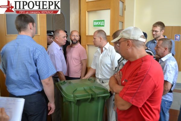 Однак міліціонери їх не пускають, пояснюючи, що сміттєвий бак не слід заносити на засідання виконкому.
