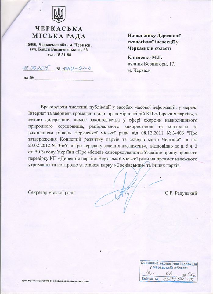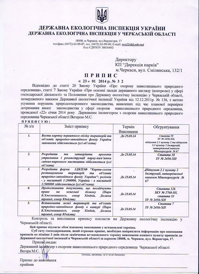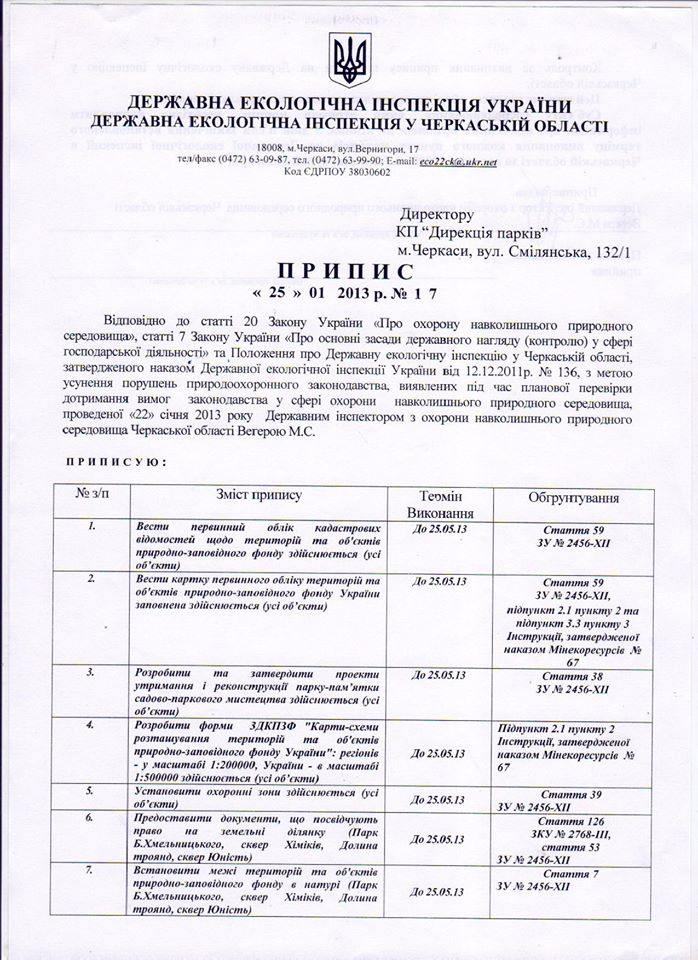 З приводу перевірки КП «Дирекція парків» екологічною інспекцією.
