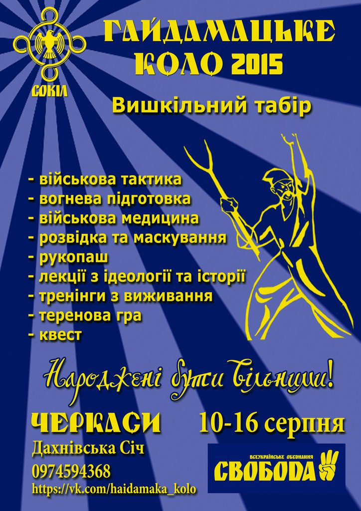 Із 10 по 16 серпня 2015 року в Черкасах на Дахнівській Січі Всеукраїнська громадська організація «Сокіл» проведе вишкільний табір «Гайдамацьке коло – 2015».