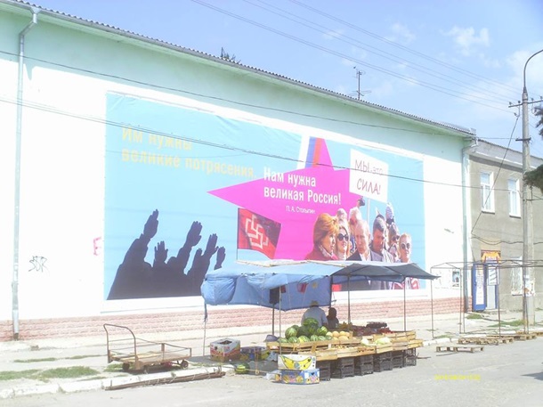 “Им нужны великие потрясения, нам нужна великая Россия. Ми – это сила”, – написано на плакаті. Настільки неоднозначне зображення розмістили майже навпроти прокуратури Джанкоя, пишуть у соцмережах мешканці окупованого кримського міста.