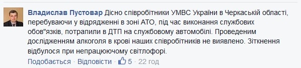 «Дійсно співробітники УМВС України в Черкаській області, перебуваючи у відрядженні в зоні АТО, під час виконання службових обов"язків, потрапили в ДТП на службовому автомобілі. Проведеним дослідженням алкоголя в крові наших співробітників не виявлено. Зіткнення відбулося при непрацюючому світлофорі», – повідомив Владислав Пустовар у «Фейсбуці» громадянам.