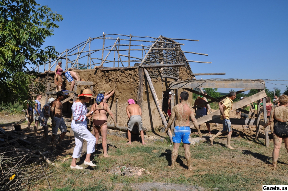 Роботу почали біля 10.00. Спершу робили заміс із глини, води та полови. Поки дорослі місили глину ногами, діти бавилися у тому замісі, купались у багнюці та кидалися глиняними кульками. Молодь малювала глиною тризубці на спинах. Потім із замісу робили глиняні вальки, якими викладали стіни.