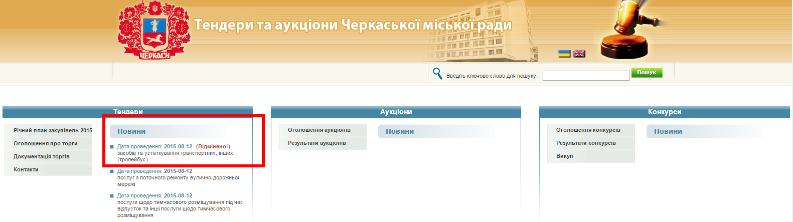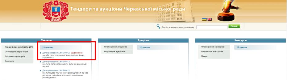 На сайті Черкаської міської ради в розділі Тендери та аукціони з’явилася інформація про скасування аукціону з закупівлі нових тролейбусів http://www.tenders.ck.ua/index.php