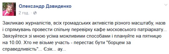 «Закликаю журналістів, всіх громадських активістів різного масштабу, назв і спрямувань провести спільну перевірку кафе московського патріархату... Зв’язуйтеся зі мною усіма можливими способами і плануйте на п’ятницю на 10.00. Хто не візьме участь – перестає бути "борцем за справедливість"...» – пише державний службовець.