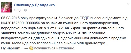 Прокуратура Черкас 5 серпня внесла до Єдиного реєстру досудових розслідувань відомості за ознаками кримінального правопорушення, передбаченого нормами ч.1 ст.197-1 КК України за фактом самовільного зайняття земельних ділянок площею 485 кв. м., які незаконно використовуються для здійснення підприємницької діяльності з продажу квітів.