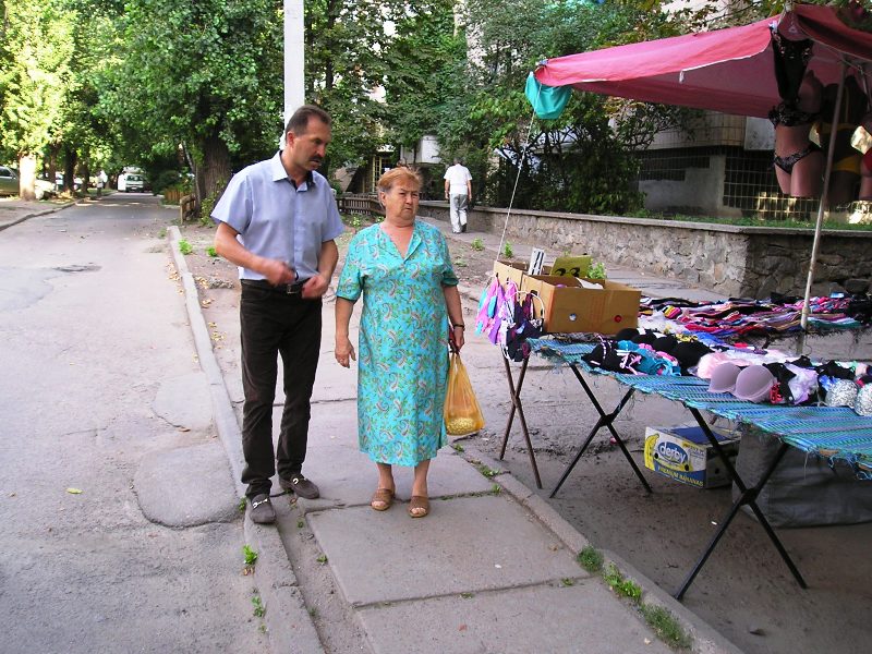 – Передовсім, спільний двір цих будинків зробили прохідним численні автівки, що підвозять на базар товар або паркуються на місцевих клумбах. Адже біля самого базару все просто «забито» автівками. У будинках цих мешкає чимало людей похилого віку, а також дітей, що найбільше ризикують від такого «раллі» на пішохідних доріжках, – розповів він. – Частину тротуару та прибудинкової території захопили «лоточники», що не помістились на базарі. Апофеозом цієї вакханалії стала поява на прибудинковій території МАФу. Як типова прикмета незаконного кіоску, його «фундаментом» стала звичайна цегла. Мешканцям, враженим таким «розмашистим» дерибаном території біля їх будинків, скоро дійсно не буде як пройти до зупинки. Про прогулянки у дворі, яким «шмигають» авто, взагалі можна не згадувати.