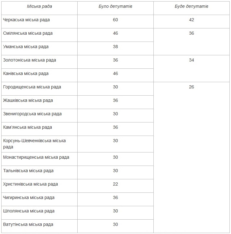 Так, у Черкаській міській раді до тепер ми мали 60 депутатів, а зараз їх буде лише 42. Найбільше депутатів у раді – по 36 осіб – матимуть міста Умань (було 38) і Сміла (було 46), по 34 особи – Золотоноша (було 36) і Канів (було 46). Усі інші міста області будуть представлені лише 26 обранцями. І тільки на Христинівську міську раду не вплине ідея Закону про зменшення кількості депутатів, адже тут їх збільшиться на 4 особи.