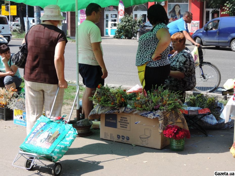 "Всі трави вирощую вдома. Букетики польових трав почала продавати лише до свята, а так торгую іншими квітами. Як свято, то можна заробити. На Івана Купала плели вінки. Робота з букетами до Спаса дуже трудоємка, поки зробиш заготовки із трав. Було, що і 70 букетиків в день продала. Віддаю по 15 гривень", - розповідає продавчиня Тамара, торгує квітами по вулиці Гоголя неподалік центрального ринку. Продавці розповідають, що готуються до свята заздалегідь. Багато хто продає трави, які вирощує дома. Торгувати починають за день-два до свята.