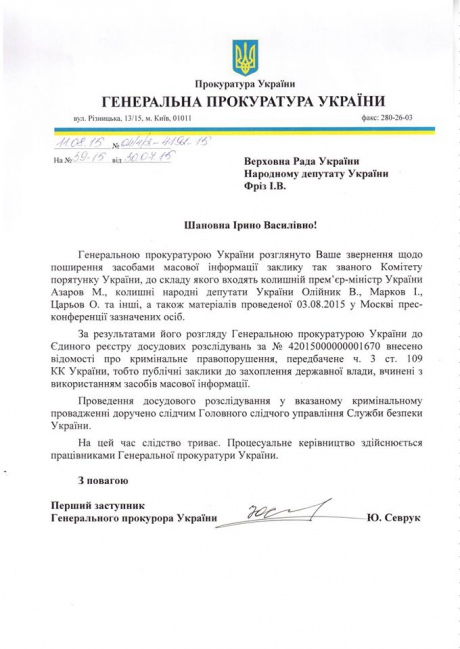 Генеральна прокуратура України порушила кримінальну справу за фактом заяв так званого "Комітету порятунку України", створеного у Москві екс-главою українського уряду Миколою Азаровим. Про це 15 серпня повідомила нардеп від БПП Ірина Фріз, пише "Українська правда".
