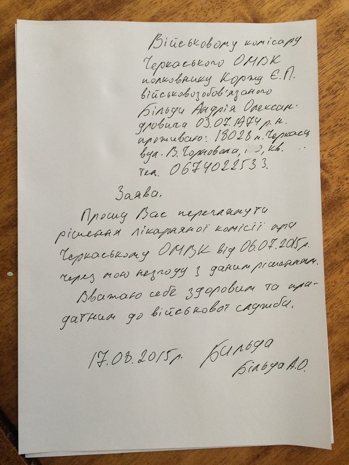 Фото заяви, у якій депутат звертається до військового комісара з проханням переглянути рішення лікарської комісії, він виклав на своїй сторінці у Фейсбуці.