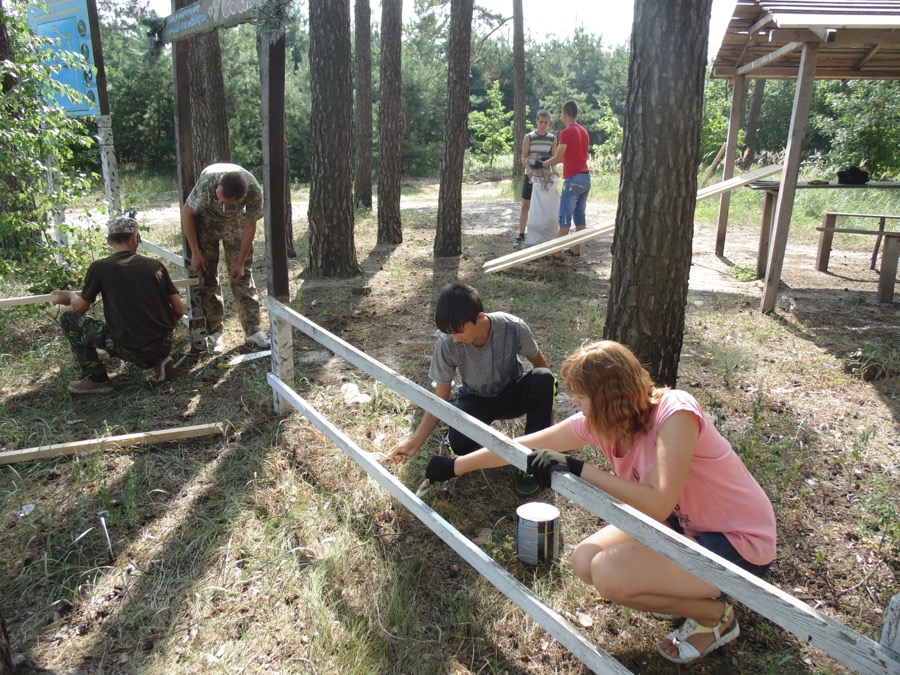 Також навідалися юні лісівники до рекреаційного пункту «У соснах». Тут вони самі полюбляють відпочивати, бо розташоване місце відпочинку неподалік від екологічної стежки, що належить до навчальної бази шкільного лісництва. В цьому рекреаційному пункті полагодили дах альтанки, відремонтували і пофарбували лавочки та поновили написи.