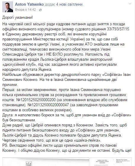 «На черговій сесії міської ради кадрове питання щодо зняття з посади офіційно визнаного корупціонера, за те, що сам собі подарував землю в центрі Умані, а учасникам АТО знайшов лише на сміттєзвалищі, тимчасово виконуючого обов’язки мера Умані Олександра Цебрія так і НЕ БУЛО розглянуто. Натомість під головуванням крадія Льоліка-Цебрія влаштували аматорський «дискусійний клуб», під час засідання якого активно критикували народного депутата Яценка.