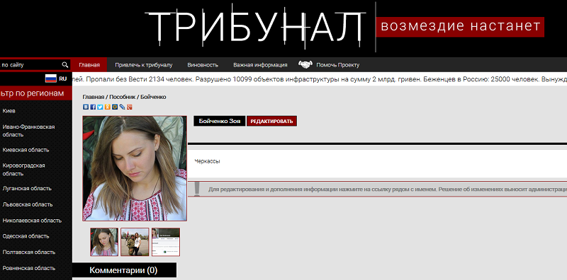 Громадську активістку з Черкащини Зою Бойченко сепаратисти записали до пособників “каратєлєй” на своєму сайті “Трибунал”, пише progolovne.ck.ua